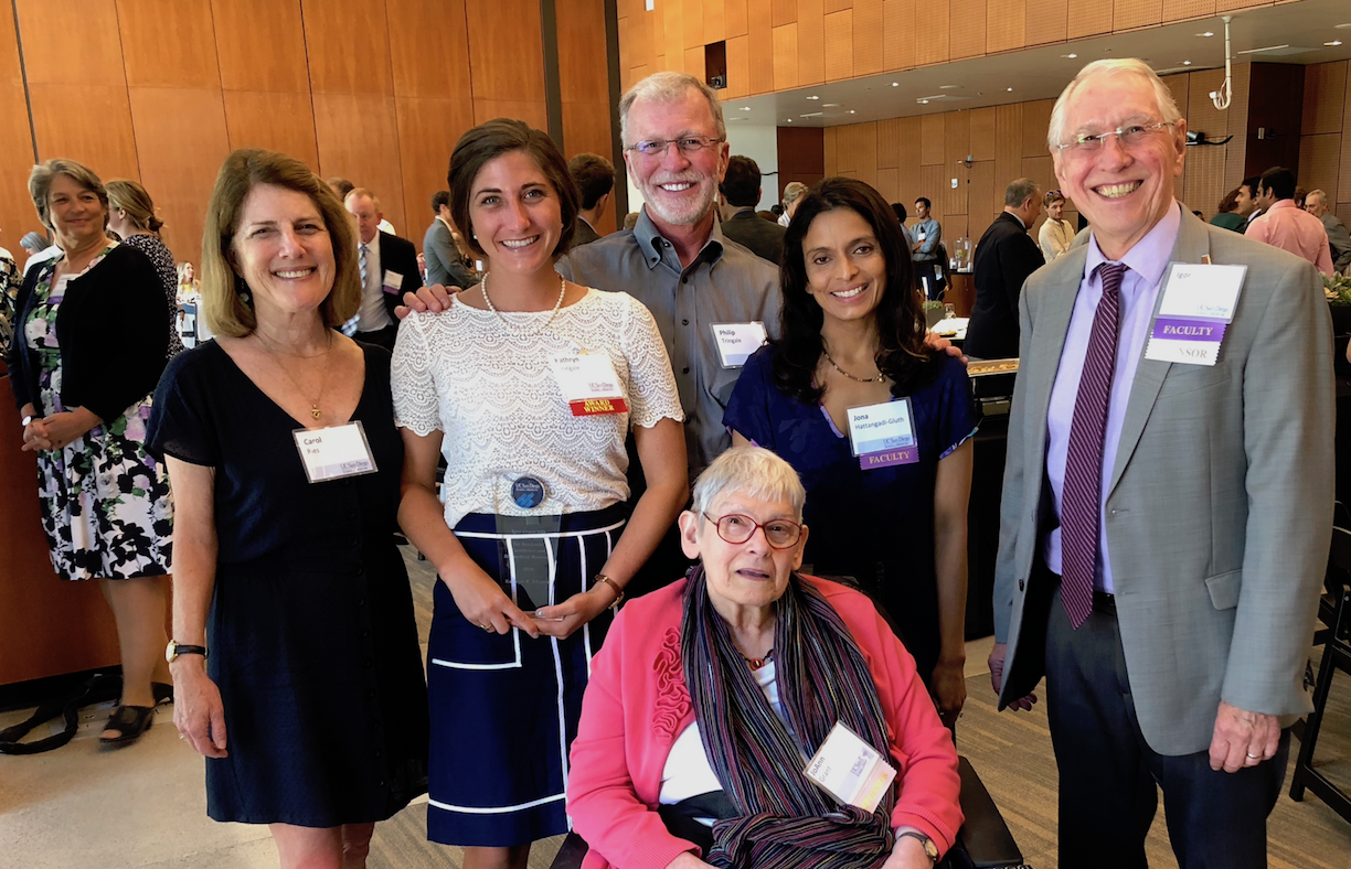 On June 2, 2018 Graduating UCSD medical student Kathryn Tringale receives the Igor Grant MD Endowed Award for Academic Excellence and Biomedical Research. Kathryn is an outstanding student who will be pursuing residency training in radiation oncology at Memorial Sloan Kettering Cancer Center. Pictured are Kathryn’s mother Carol Ries, Kathryn, her father Philip Tringale, her faculty mentor Professor Jona Hattangadi-Gluth, Igor Grant, MD. JoAnn Grant, RN [seated] established the endowed award to honor her husband. In left background, Carolyn Kelly MD, Associate Dean for Admissions and Student Affairs. Congratulations Kathryn!